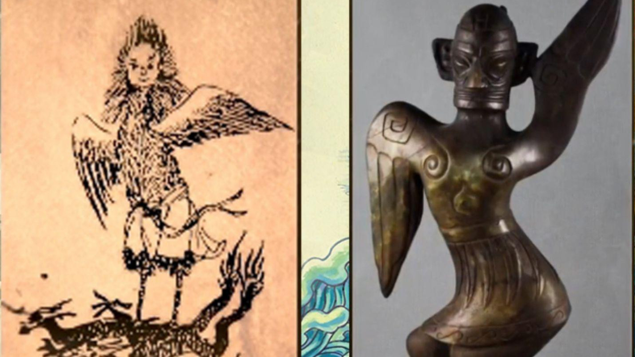 Ảnh trái: Thần Câu Mang, thân chim mặt người, cưỡi trên hai con rồng trong Sơn Hải Kinh. Ảnh phải: Tượng đồng được tìm thấy ở Tam Tinh Đôi. (Ảnh chụp từ video Epoch Times)