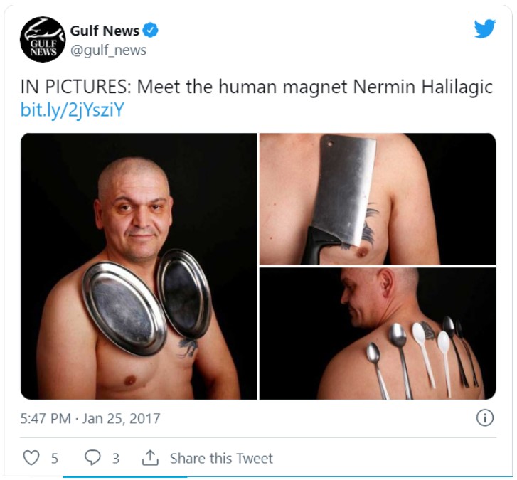 Nhưng Nermin Halilagic 38 tuổi đến từ Bihac, Bosnia và Herzegovina thì đặc biệt hơn, khi còn nhỏ đã phát hiện ra rằng anh có khả năng đặc biệt này là hấp thụ các vật thể khác. Anh thậm chí có thể hút những thứ khác không phải là kim loại, và những thứ này bao gồm điều khiển từ xa, sản phẩm nhựa, điện thoại di động hoặc bát đĩa sứ, khiến mọi người cảm thấy rất khó tin.