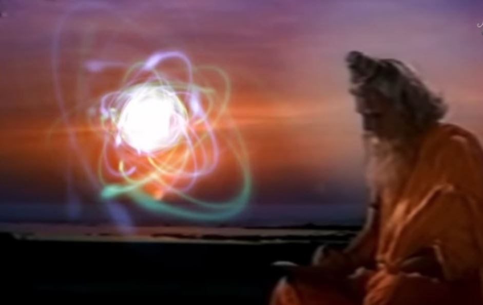 Ảnh mô tả nhà hiền triết Acharya Kanad và kết luận của ông. (Ảnh: chụp từ video)