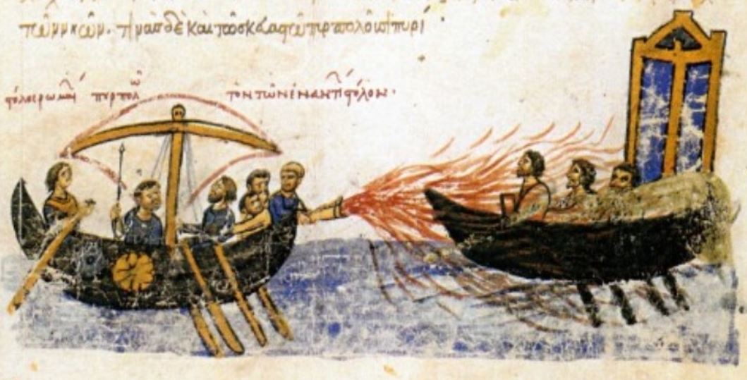 Bản thảo minh họa, Madrid Skylitze, cho thấy Lửa Hy Lạp đang được sử dụng để chống lại đoàn quân nổi loạn Thomas the Slav. (Ảnh: Wikimedia Commons)