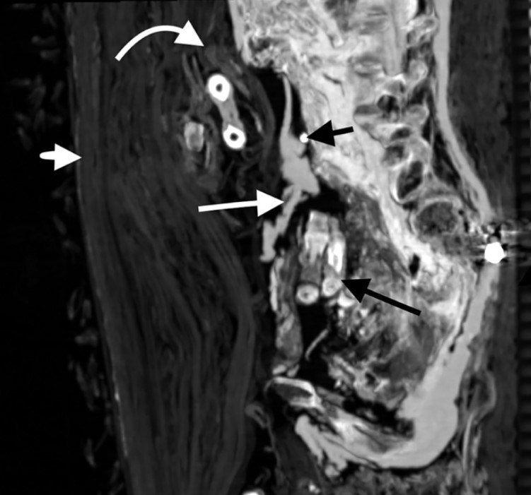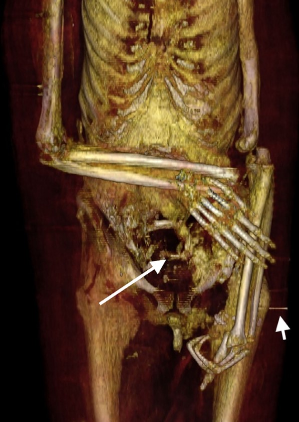 Hai ngón tay bị thiếu của bàn tay trái được đặt bên trong khoang cơ thể (nhìn theo hướng mũi tên dài màu đen). (Ảnh: Đăng dưới sự cho phép của Sahar N. Saleem và Zahi Hawass)