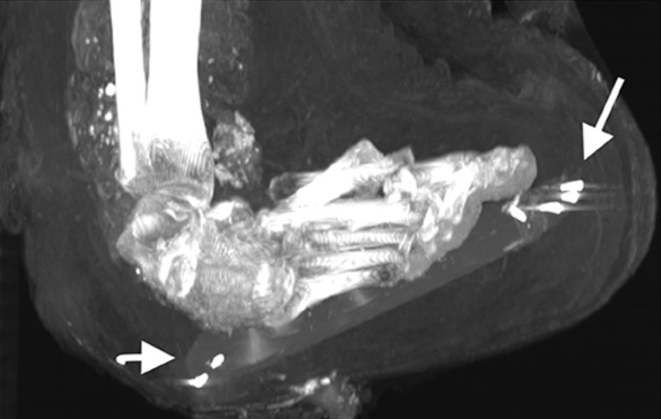 Bàn chân phải của xác ướp [pharaoh] Amenhotep I với những chiếc đinh có khả năng được ghim vào để cố định vị trí của mảng gỗ với các lớp bọc xung quanh. (Ảnh: Đăng dưới sự cho phép của Sahar N. Saleem và Zahi Hawass)