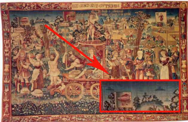 Tấm thảm nổi tiếng ở Bruges, Bỉ được ra đời từ năm 1538 và hiện đang nằm trong viện bảo tàng quốc gia Bayerisches. Trên tấm thảm rõ ràng có in hình những vật thể bay giống như miêu tả của các UFO mà dù khó hiểu đi chăng nữa nó cũng đã là một họa tiết của Triumph’s Summer. Một số người tin rằng các UFO được thêm vào để tôn vinh sự cai trị của Thiên Chúa. Một câu hỏi đặt ra tại sao người Bỉ thế kỷ 16 lại có thể vẽ được chiếc đĩa bay và liên tưởng chúng tới đấng quyền năng?
