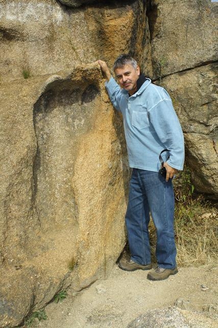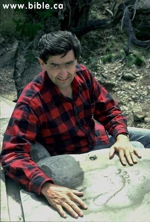 Nhà cổ sinh vật học Jerry MacDonald bên dấu chân 290 triệu năm tuổi. (Ảnh: Bible.ca)