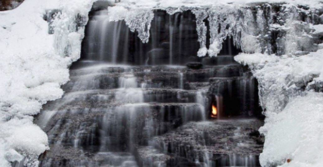 Dòng thác mùa đông có tuyết đống băng và ngọn lửa vẫn sáng bình thường.
