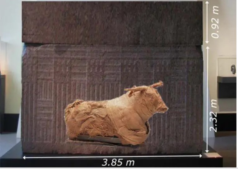 So sánh kích thước của xác ướp một con bò đực (dài khoảng 2,3 mét) và một chiếc quan tài Serapeum dựa trên phép đo của Linant-Bey.