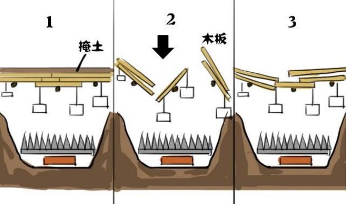 Bên trong những chiếc hố này đặt rất nhiều những thanh kiếm dài và vô vàn những loại vũ khí sắc nhọn khác nhau. Bên trên hố được đậy kín bằng một tấm ván gỗ. Phía dưới tấm ván treo một vật nặng tương đương sức nặng của một người trưởng thành, phía trên tấm ván được bao phủ, "ngụy trang" bằng một thứ tựa như những tấm gạch lát nền.