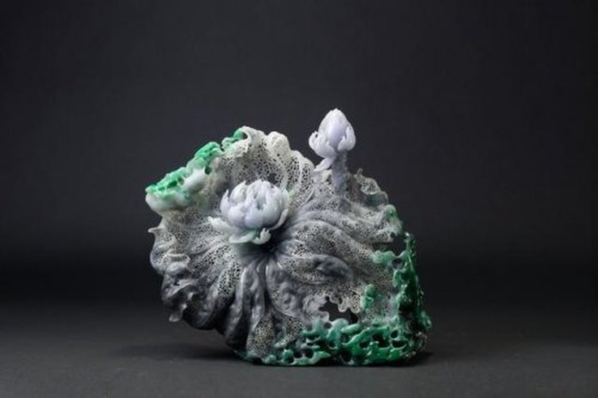 Ngó sen ngọc được chế tác tuyệt đẹp. Bên trên ngó sen này còn có lá sen màu xanh mọc ra và nở ra một bông hoa sen màu hồng phấn. Bên cạnh hoa sen còn treo một số viên mã thầy màu đen.