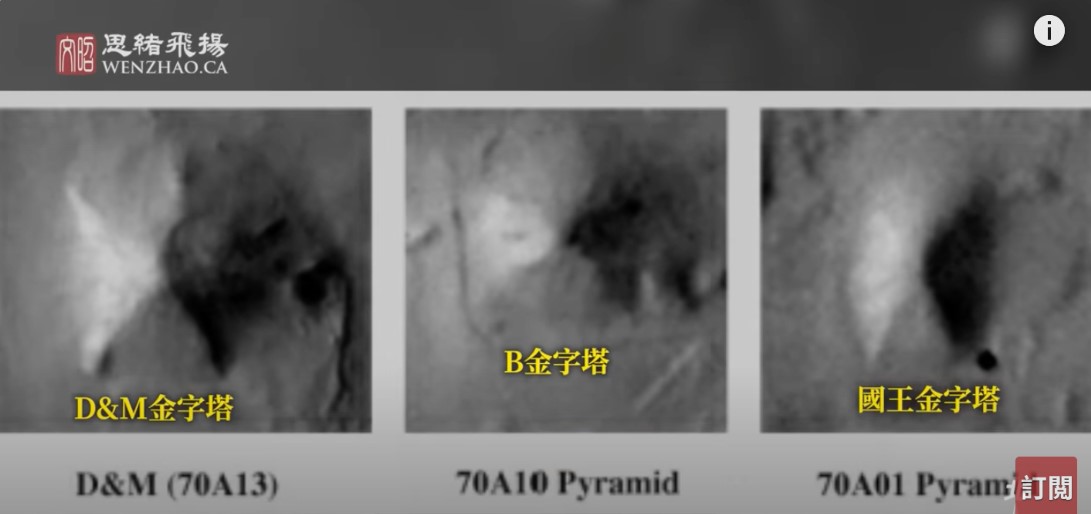 Tiến sĩ Carloto cũng phát hiện ra rằng ngoài mặt người trên sao Hỏa, còn có một số tòa nhà hình kim tự tháp ở khu vực Cydonia. Nổi tiếng nhất là kim tự tháp ngũ giác D&M và xung quanh nó có những tòa nhà giống như lâu đài.