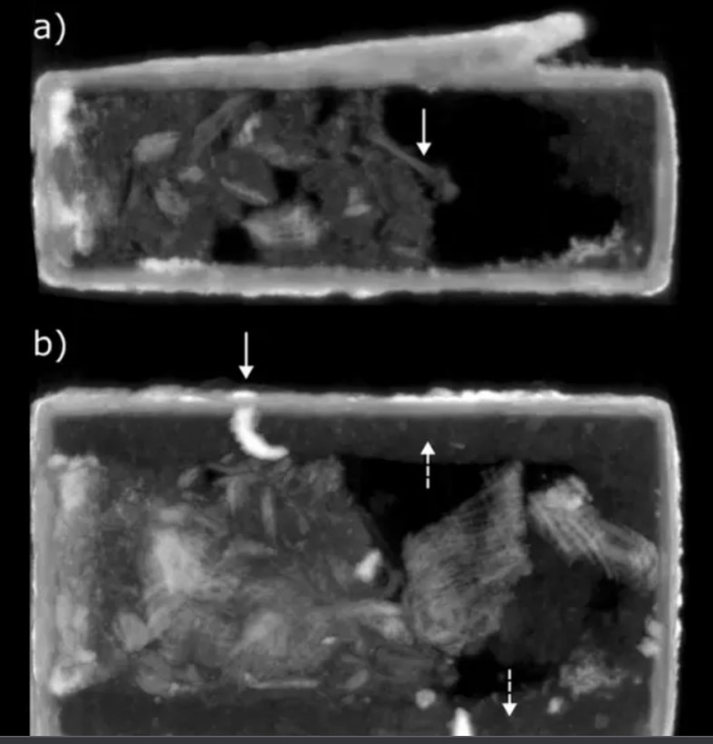 Hình ảnh CT neutron: (a) nhìn từ bên, cho thấy sự hiện diện của một xương dài 8,1 mm (mũi tên đặc); (b) nhìn từ trên xuống, cho thấy sự hiện diện của vải dệt (mũi tên liền) và vật liệu lõi (mũi tên nét đứt). (Ảnh: Scientific Report)