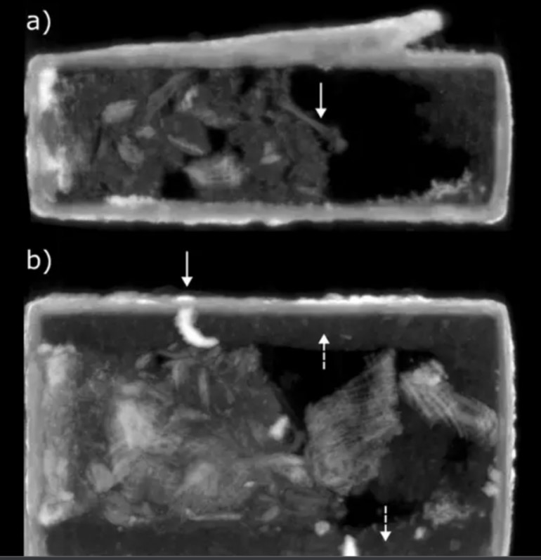Hình ảnh CT neutron: (a) nhìn từ bên, cho thấy sự hiện diện của một xương dài 8,1 mm (mũi tên đặc); (b) nhìn từ trên xuống, cho thấy sự hiện diện của vải dệt (mũi tên liền) và vật liệu lõi (mũi tên nét đứt). (Ảnh: Scientific Report)