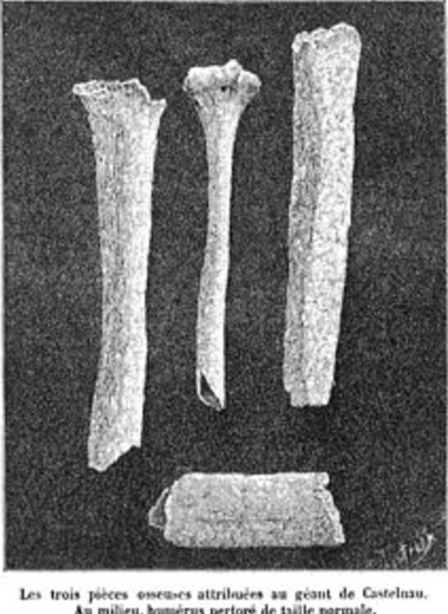 Theo Georges Vacher de Lapouge, ba mảnh xương được đặt tên là "Người khổng lồ của Castelnau" so với một khúc xương chày của hài cốt có kích thước thông thường (ở giữa). (Ảnh: Wikipedia)