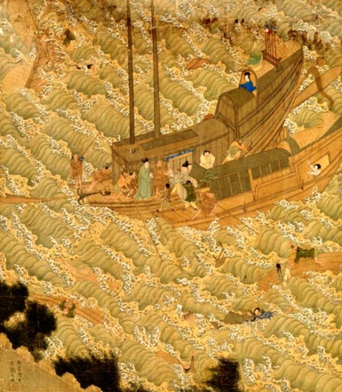 Thuyến đến giữa dòng, cuồng phong nổi dậy, thuyền lắc lư muốn lật (Tranh vẽ đời Minh của Dư Nhâm, Ngô Việt). Nguồn ảnh: soundofhope