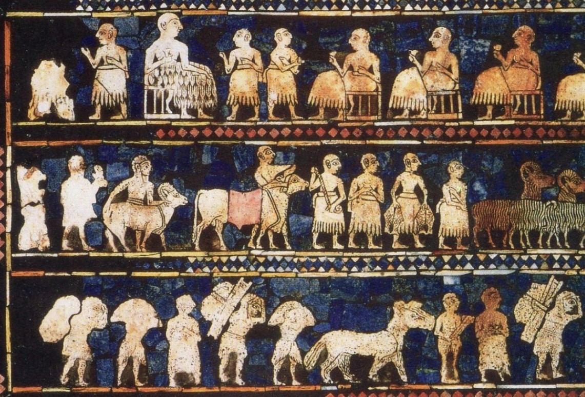 Khảm trên lăng mộ hoàng gia Ur, được làm từ lưu ly và vỏ sò, thể hiện thời thịnh trị
