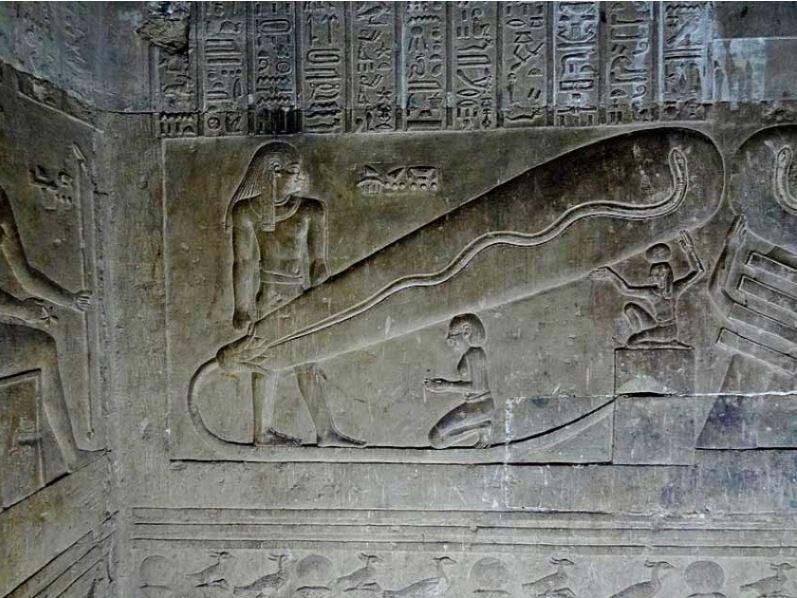 Ví dụ, các bức phù điêu được phục hồi từ ngôi đền phía nam Hathor cho thấy việc sử dụng ánh sáng điện ở Ai Cập cổ đại. Những hình chạm khắc này cũng được tìm thấy tại đền thờ Dendera, và có niên đại khoảng năm 50 trước Công nguyên.