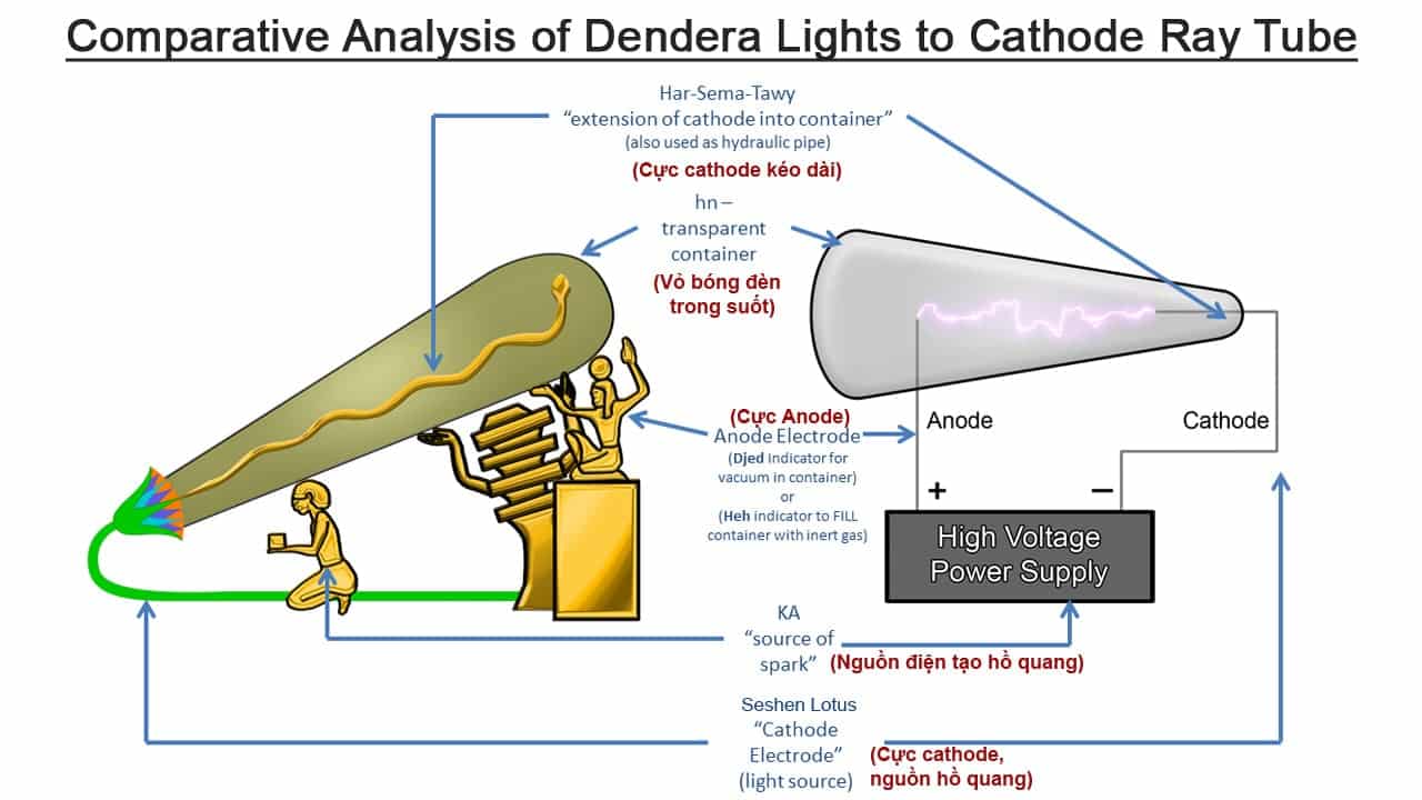So sánh cấu tạo giữa bóng đèn được mô tả tại đề thờ thần Hathor, Dendera, Ai Cập và bóng đèn hồ quang thời hiện đại (ảnh: africancreationenergy)