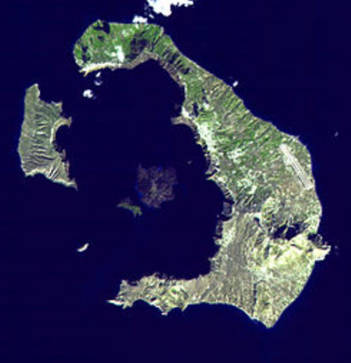 Hình ảnh vệ tinh của các đảo Santorini. Từ sự kiện phun trào Minoan và việc phát hiện ra Akrotiri năm 1964 trên đảo, vị trí này là một trong nhiều địa điểm được cho là địa điểm của Atlantis huyền thoại. (Ảnh: Wikipedia)
