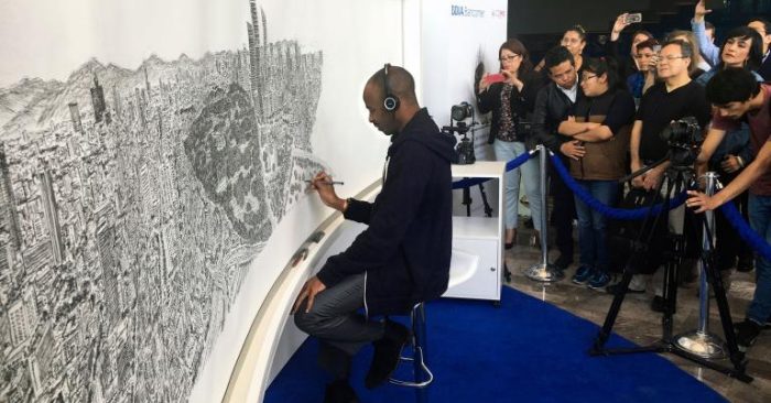 Stephen vẽ toàn cảnh thành phố Mexico trước sự chứng kiến của nhiều người (ảnh: Paolo Woods)