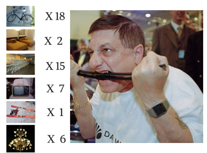 Bức ảnh dưới đây không phải trưng bày sản phẩm mà là “thực đơn” đã từng “thưởng thức” bởi một người đàn ông nước Pháp. Michel Lotio đã ăn tất cả mọi thứ từ xe đạp, dao cạo râu, nhựa, thủy tinh… Ông ăn kèm chúng với dầu ăn và nước cho dễ nuốt.