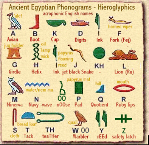 Hệ thống chữ viết Ai Cập là hệ chữ tượng hình, xuất hiện lần đầu tiên từ năm 6000 trước Công nguyên. Chữ tượng hình là sự miêu tả đơn giản các từ ngữ mà chúng đại diện, nhưng có những hạn chế nhất định. Theo thời gian, người Ai Cập đã thêm vào một số nhân tố khác vào hệ thống chữ viết của họ, bao gồm các ký tự như alphabet đại diện một số âm nhất định và các kí tự khác, cho phép họ viết ra tên và các khái niệm trừu tượng.