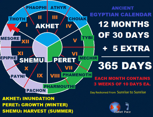 Lịch của người Ai Cập xây dựng để phù hợp với tập quán nông nghiệp và được chia thành ba mùa chính: ngập lụt, phát triển và thu hoạch. Mỗi mùa có bốn tháng, mỗi tháng được chia thành 30 ngày, tất cả là 360 ngày một năm ngắn hơn thực tế một vài ngày. Người Ai Cập đã thêm vào năm ngày giữa mùa thu hoạch và ngập lụt. Năm ngày này được chỉ định riêng là ngày lễ tôn giáo để tôn vinh những người con của các vị thần.