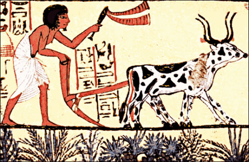 Nhưng mọi thứ đã thay đổi vào những năm 2000 trước Công nguyên, khi lần đầu tiên người Ai Cập dùng bò để kéo cày. Cách đầu tiên họ sử dụng là buộc cày vào sừng nhưng lại làm gia súc gặp khó khăn khi thở. Về sau họ đã cải tiến bằng cách sử dụng hệ thống dây chằng buộc để đạt hiệu quả cao hơn. Cày đã tạo ra cuộc cách mạng nông nghiệp ở Ai Cập cổ đại, và cùng với chế độ nước đều đặn của sông Nile, việc canh tác nông nghiệp ở xã hội Ai Cập đã trở nên thuận lợi hơn rất nhiều khi so với các nền văn minh khác thời bấy giờ