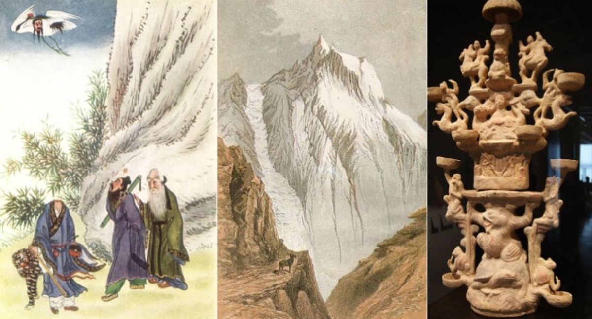 Trái: Một bức tranh về Tưởng Tử Văn tại núi Côn Luân, mô tả khung cảnh trong một truyền thuyết Trung Quốc. Giữa: Đỉnh trong dãy Côn Luân. Phải: Ngọn đèn từ thế kỷ thứ 1 - thứ 2 có hình núi Côn Luân như cột trời, một cõi của Tây Vương Mẫu. (Ảnh: Tổng hợp)