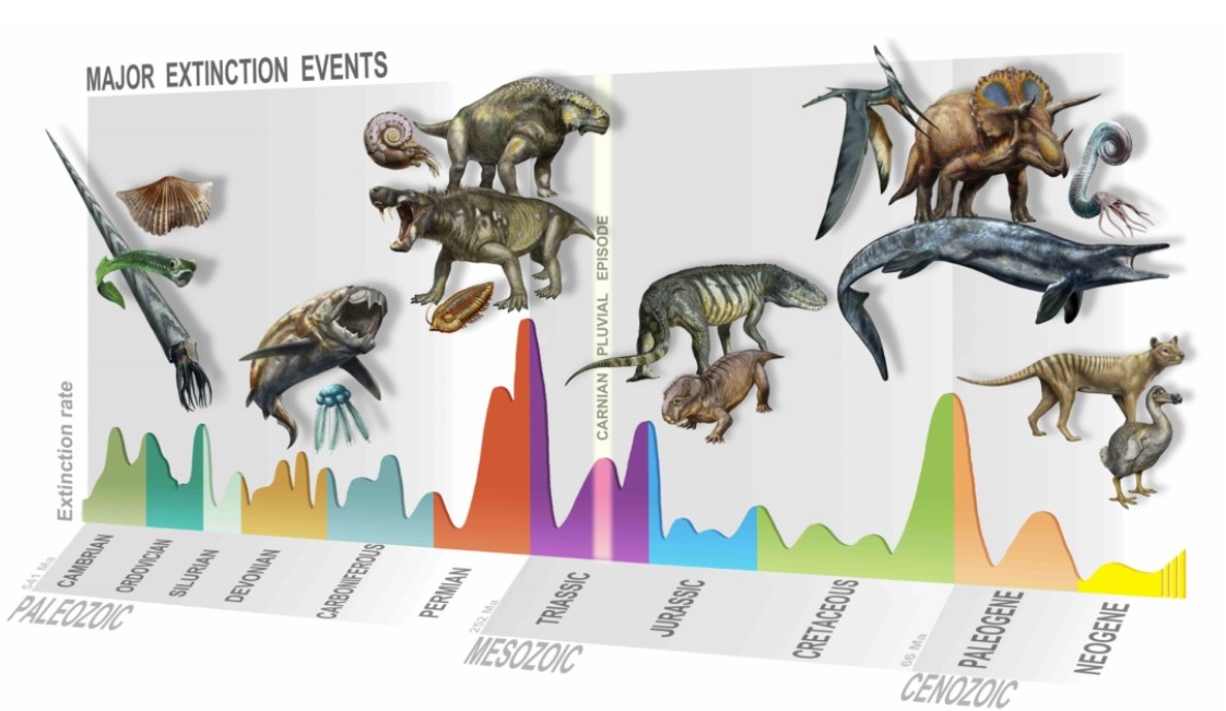 Tóm tắt các cuộc đại tuyệt chủng lớn trong 500 triệu năm qua, đợt tuyệt chủng mới phát hiện mang tên Carnian Pluvial Episode đã xảy ra vào khoảng 233 triệu năm trước. (Ảnh: D. Bonadonna / MUSE, Trento)