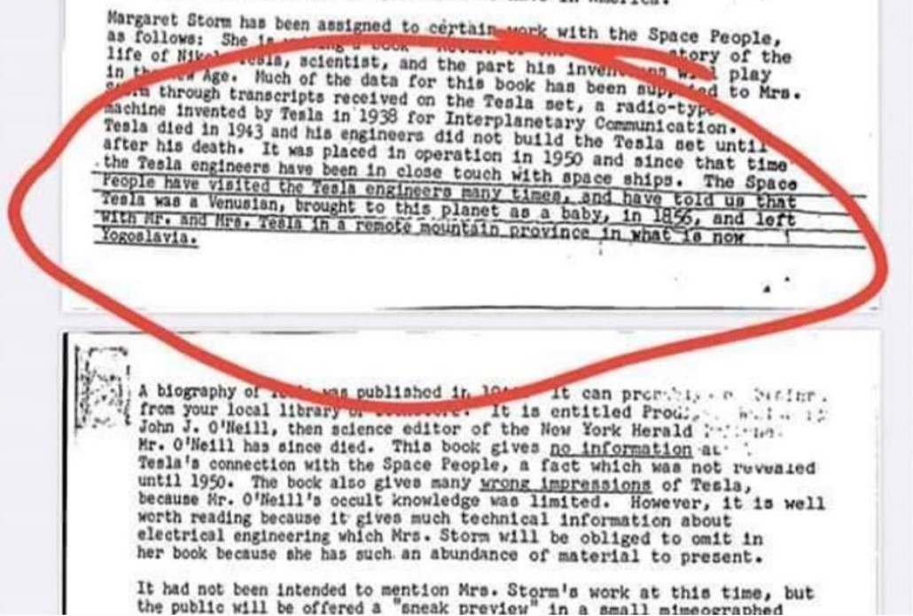 "Cư dân vũ trụ đã liên lạc với Nikola Tesla nhiều lần, và nói với FBI rằng Tesla đến từ sao Kim. Năm 1856, Tesla được đưa đến trái đất và trao cho một cặp vợ chồng Nam Tư nuôi dưỡng".