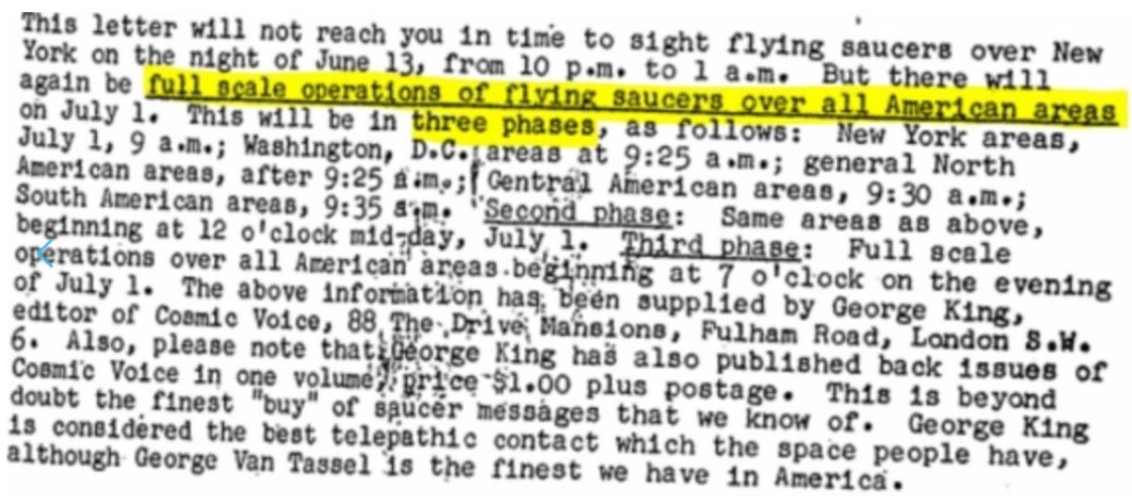 Tài liệu tiết lộ một bức thư dự báo sự xuất hiện của UFO trên lãnh thổ nước Mỹ. (Ảnh chụp màn hình)