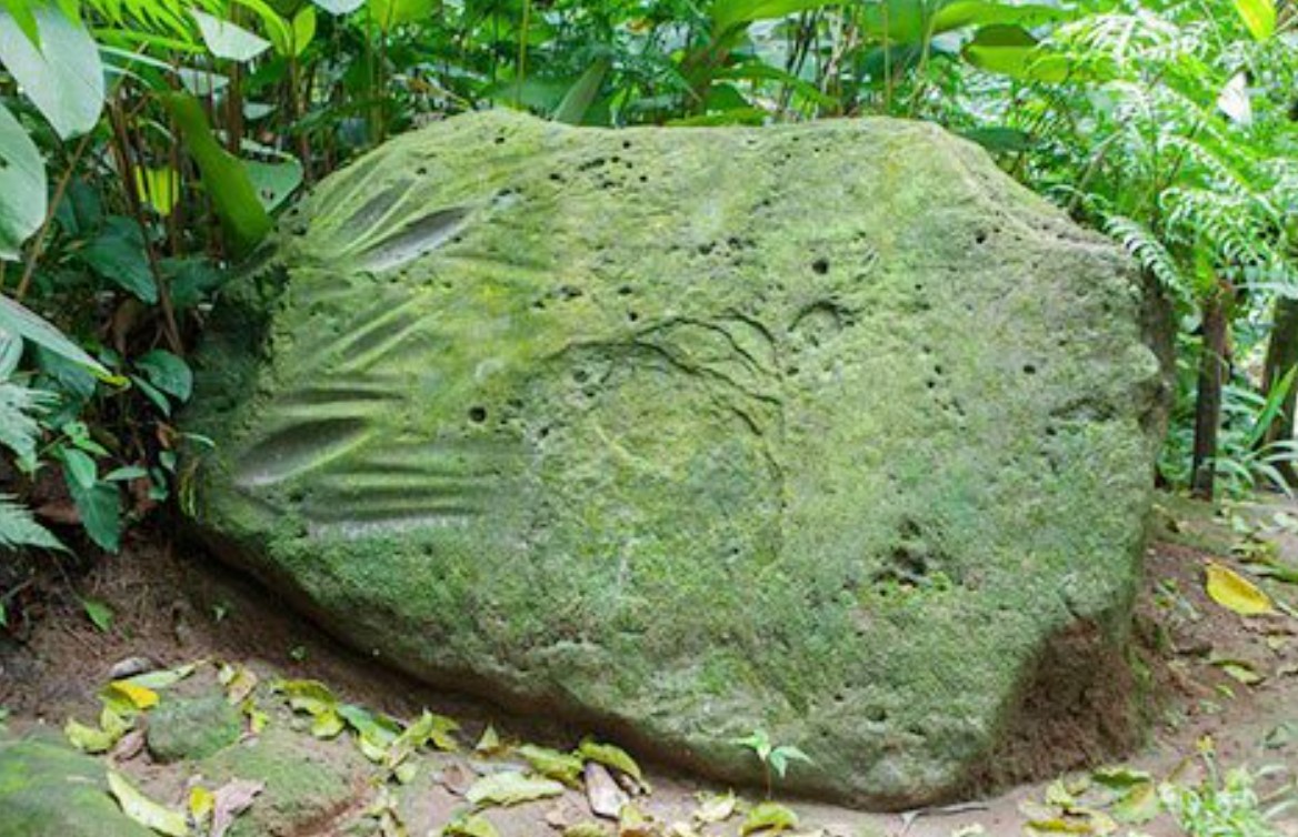 Tảng đá cổ phủ đầy rêu xanh có dấu tích chữ viết của người cổ đại Olmec.