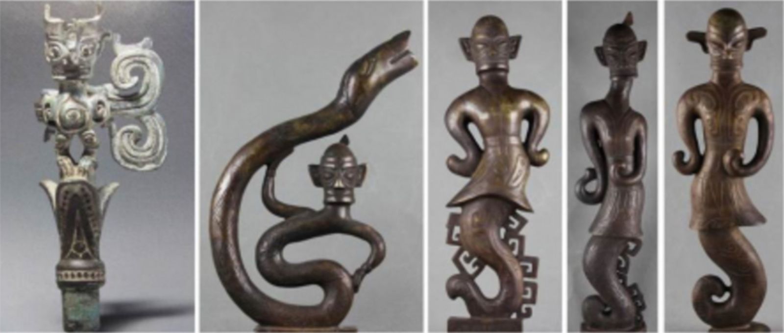 Tượng người bằng đồng được khai quật ở Tam Tinh Đôi. Bức ảnh thứ nhất bên trái là tượng đồng đầu người thân chim, bốn bức ảnh bên phải là tượng đồng đầu người mình rắn. (Ảnh: Public Domain)