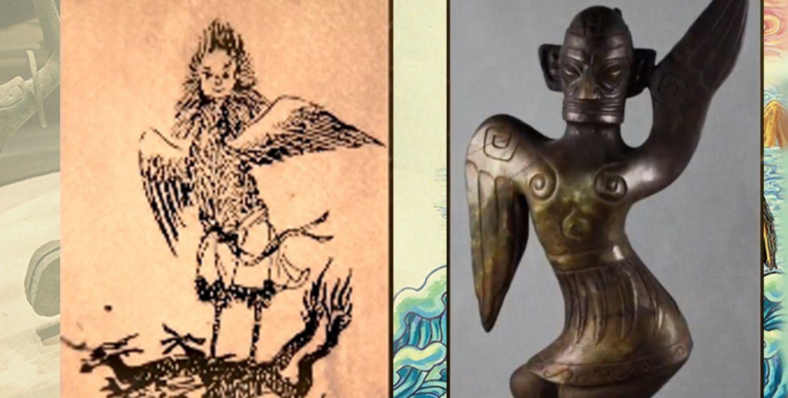 Ảnh trái: Thần Câu Mang, thân chim mặt người, cưỡi trên hai con rồng trong Sơn Hải Kinh. Ảnh phải: Tượng đồng được tìm thấy ở Tam Tinh Đôi. (Ảnh chụp từ video Epoch Times)