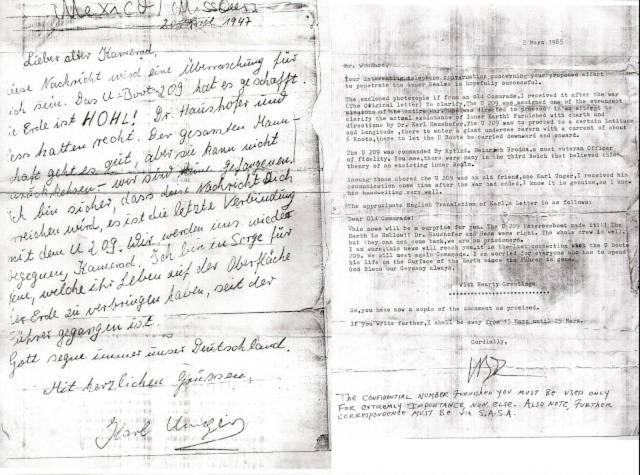 Thông điệp này sẽ làm anh ngạc nhiên. U Boat 209 đã làm được, Trái Đất là rỗng! Đúng như lời TS. Haushofer và Hess nói. Cả phi hành đoàn đang làm rất tốt, nhưng họ không thể quay trở lại. Chúng tôi không bị bắt giữ, tôi chắc chắn tin nhắn này sẽ gửi được đến tay anh nhưng sẽ là lần liên lạc cuối cùng của U-209. Tôi rất lo cho những người ở trên mặt đất vì Fuehrer (người hướng dẫn) đã biến mất.