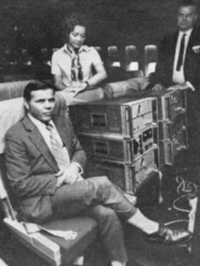 Hafele và Keating trên một chiếc máy bay thương mại, với chiếc đồng hồ nguyên tử. (Ảnh: wikimedia)