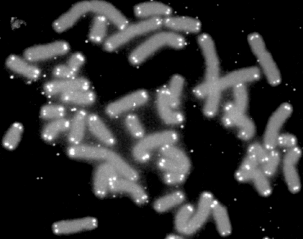 Bộ nhiễm sắc thể người chụp dưới kính hiển vi huỳnh quang với các ‘mũ’ telomere phản quang (điểm màu sáng). (Ảnh: wikimedia)
