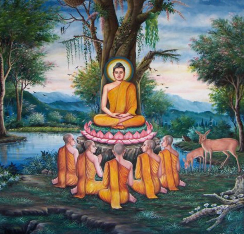 Tranh vẽ cảnh Đức Phật Phật Thích Ca Mâu Ni giảng Đạo cho năm đệ tử đầu tiên. (Ảnh: wikimedia)