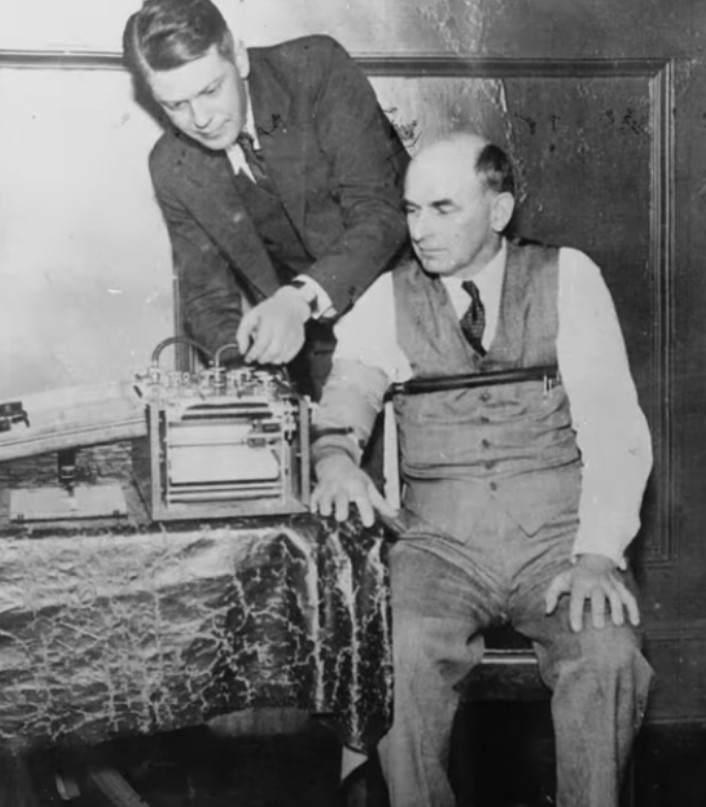 Trong CIA, ông được Leonarde Keeler (người đứng) đào tạo. Đây chính là cha đẻ của máy phát hiện nói dối (Ảnh chụp màn hình)