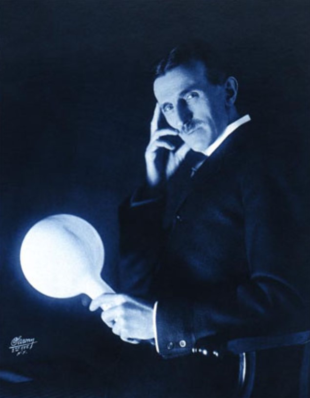 Nhà phát minh Mỹ Tesla, tay cầm thiết bị điện từ thắp sáng bóng đèn điện (Ảnh: Wikipedia)