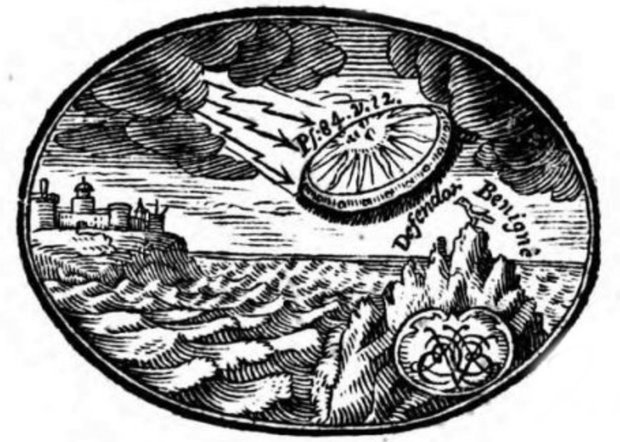 Cuốn sách viết bằng chữ Latin của tác giả Johann Caspar Funck, xuất bản vào năm 1716. Vật thể bay lạ lẩn dưới đám mây, xung quanh là những tia sét và bên dưới là biển đang nổi sóng.
