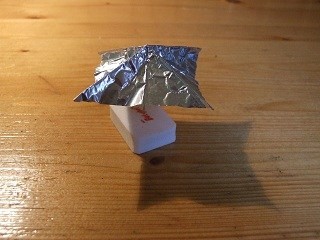Bây giờ bạn phải lấy một vật gì đó rất nhẹ, chẳng hạn như một mảnh giấy, lông vũ hoặc que diêm. Cách phổ biến nhất cho người mới là bắt đầu với một mẫu giấy gấp thành bánh xe psi. Bánh xe Psi có thể được thực hiện bằng cách cắt một mảnh giấy hình vuông, gấp nó theo chiều dọc, theo chiều ngang và đường chéo. Bây giờ, đặt mẫu giấy này trên một cây kim gắn vào một thứ có thể đứng được như hình dưới đây.