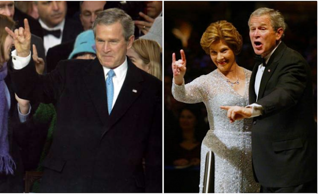 Vợ chồng cựu Tổng thống George W.Bush cùng làm dấu tay quỷ. (Ảnh: t/h)