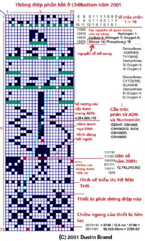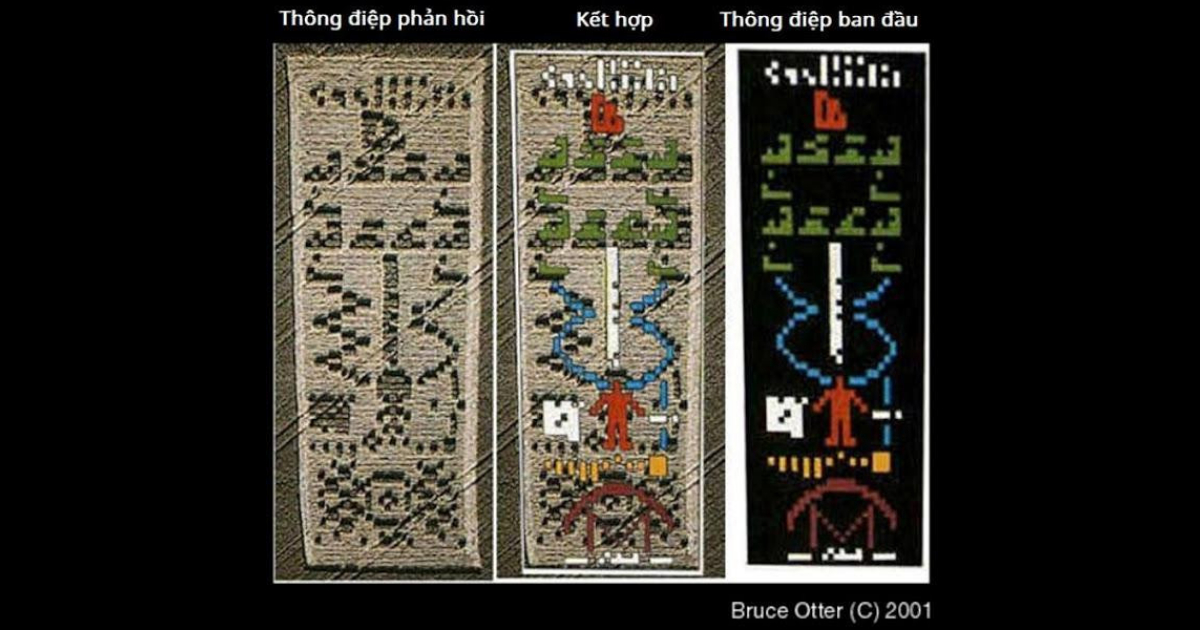 Trái: Thông điệp Arecibo nguyên gốc, Phải: Thông điệp phản hồi nhận được gần đài thiên văn Chilbolton năm 2001. (Ảnh: pinimg.com)Thông điệp phản hồi (hình dưới) đã cho chúng ta biết khá nhiều điều về những sinh mệnh thông minh ngoài kia, những thông tin cơ bản về sự sống, hình dáng bề ngoài, quy mô dân số và nơi cư ngụ của họ trong vũ trụ. Những thông tin được cung cấp trong thông điệp có sự khác biệt khá lớn với thông điệp Arecibo nguyên gốc ban đầu, cho thấy sự khác biệt giữa con người và các sinh mệnh thông minh ngoài kia ở nhiều mặt.