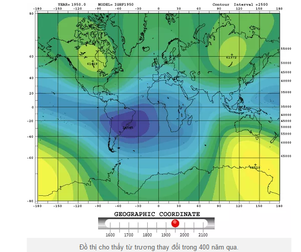 Chúng ta nhìn vào hình biểu diễn sự thay đổi lâu dài của cường độ địa từ tính trong 400 năm qua sẽ thấy từ trường yếu đi từ năm 1600. Từ năm 1800 đến năm 2000, từ trường yếu đi 10%.