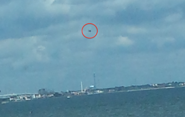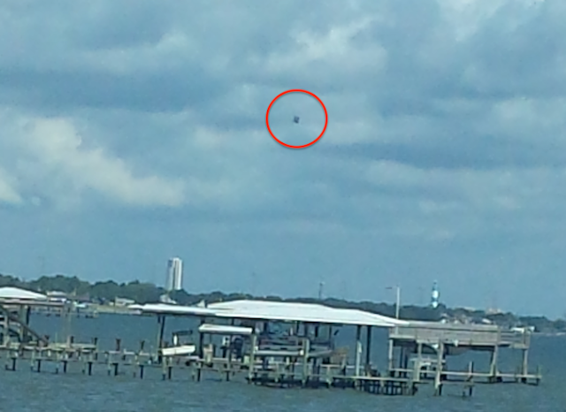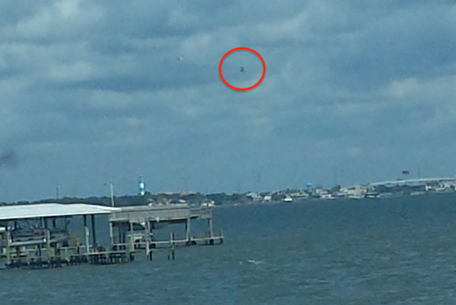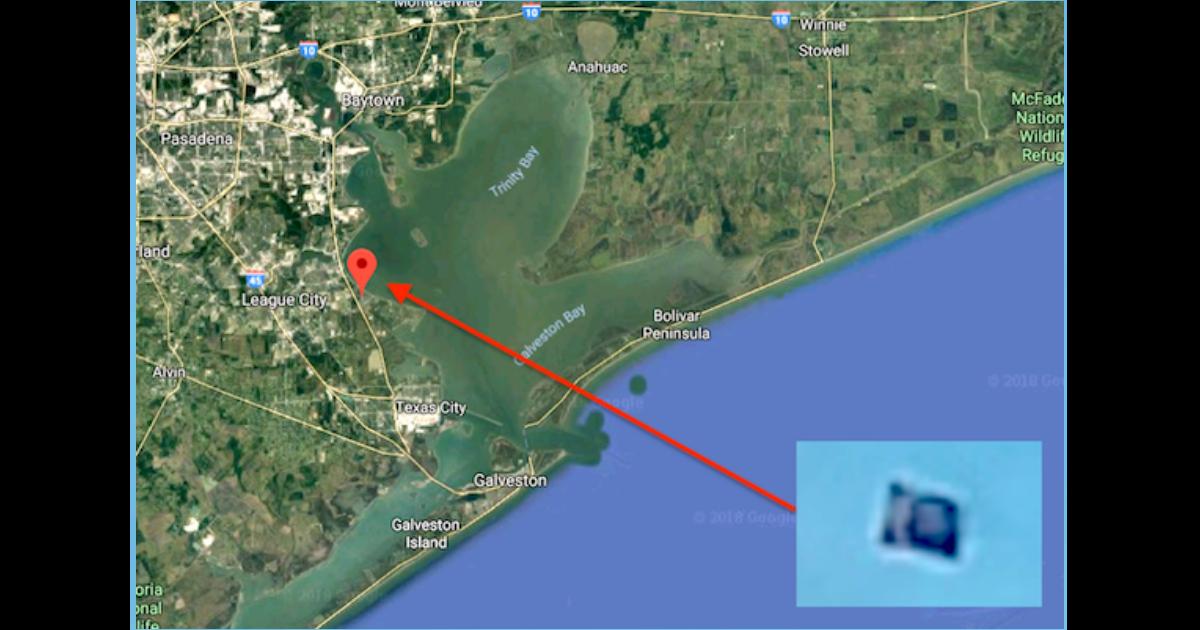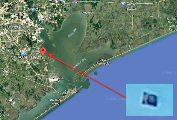 Chiếc UFO đen này được nhìn thấy trên Vịnh Trinity ở Texas. Vịnh được kết nối với Vịnh Mexico. UFO này được nhìn thấy từ hướng chính diện của Vịnh và có thể đến từ một căn cứ ngoài hành tinh dưới nước ngoài khơi xa.