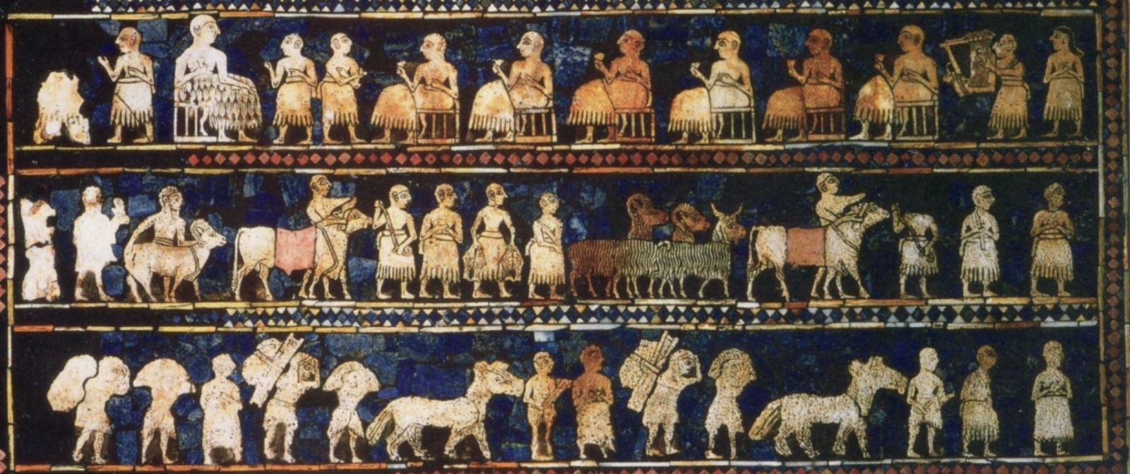Khảm trên lăng mộ hoàng gia Ur, được làm từ lưu ly và vỏ sò, thể hiện thời thịnh trị của người Sumer. (Ảnh: Wikipedia)