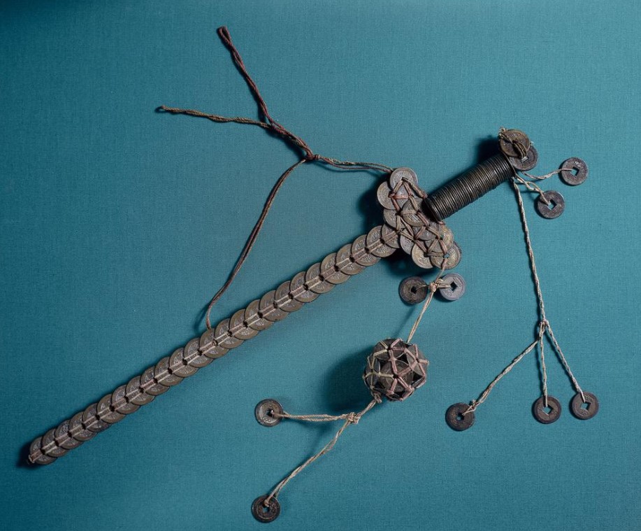 Kiếm xu làm bằng một thanh sắt với những đồng tiền Trung Quốc thế kỷ 19 được buộc vào đó bằng một sợi dây màu đỏ và xanh lá cây. (Ảnh: Bảo tàng Anh / CC BY NC SA 4.0)