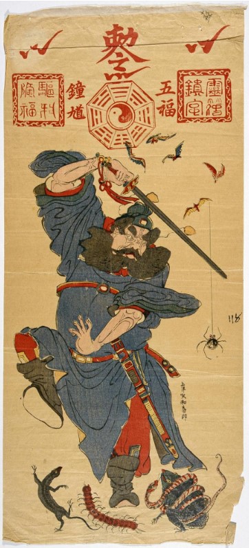 Hình vẽ mô tả người diệt quỷ Chung Quỳ với năm con dơi tượng trưng cho ngũ phúc và năm sinh vật khác. (Ảnh: Public Domain)